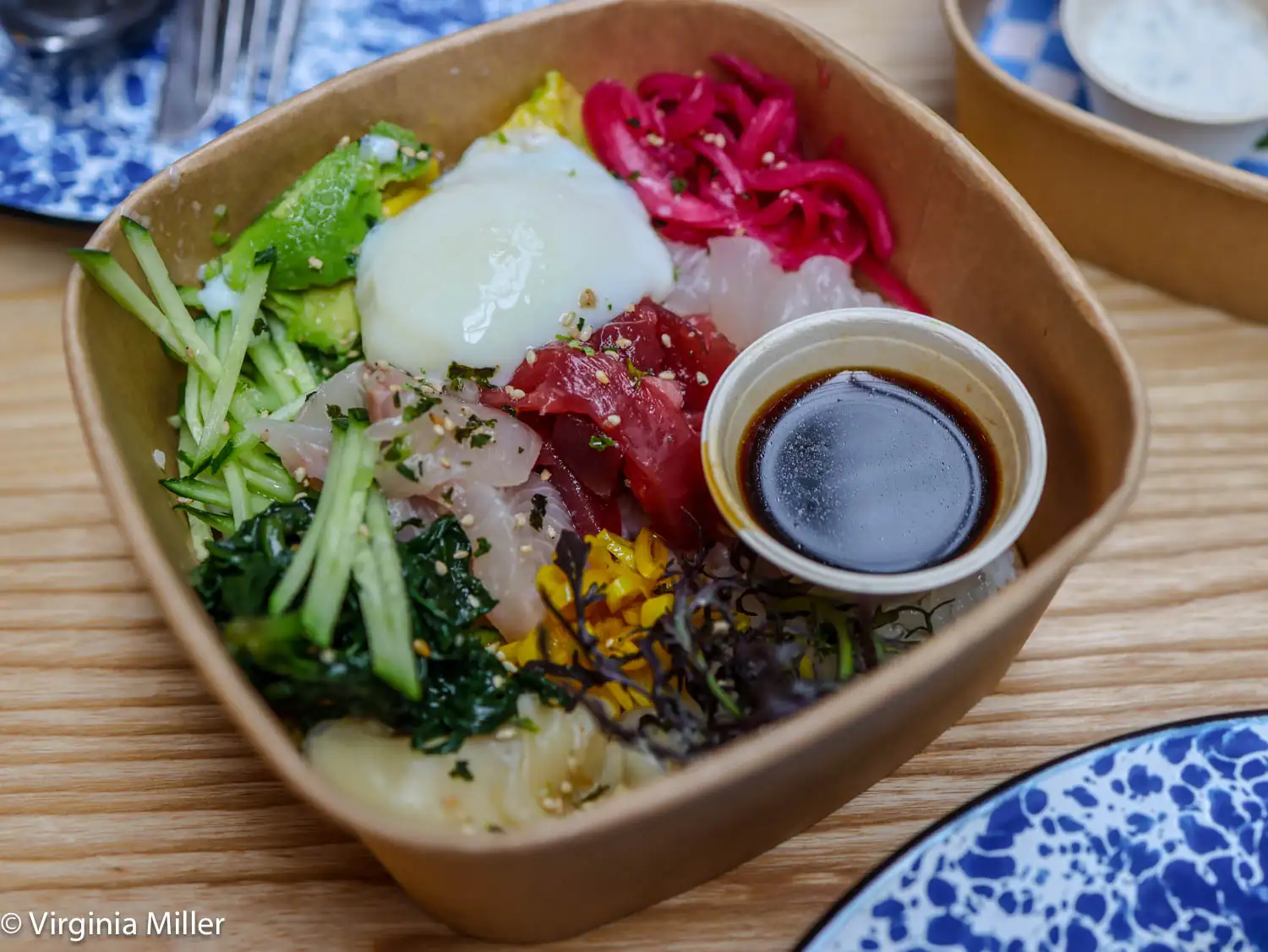 “Pristine fish over sushi rice” is another hit, an ever-changing chirashi box showcasing raw fish fresh that day, like local halibut, over Luna koshihikari organic rice grown in the Sacramento Delta, with pickled ginger and red onions, sous vide egg and assorted market greens, cucumber and avocado.